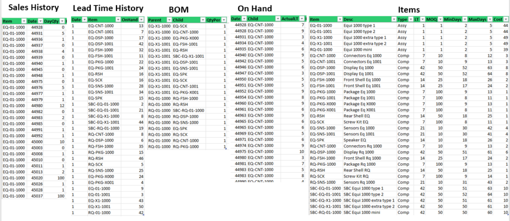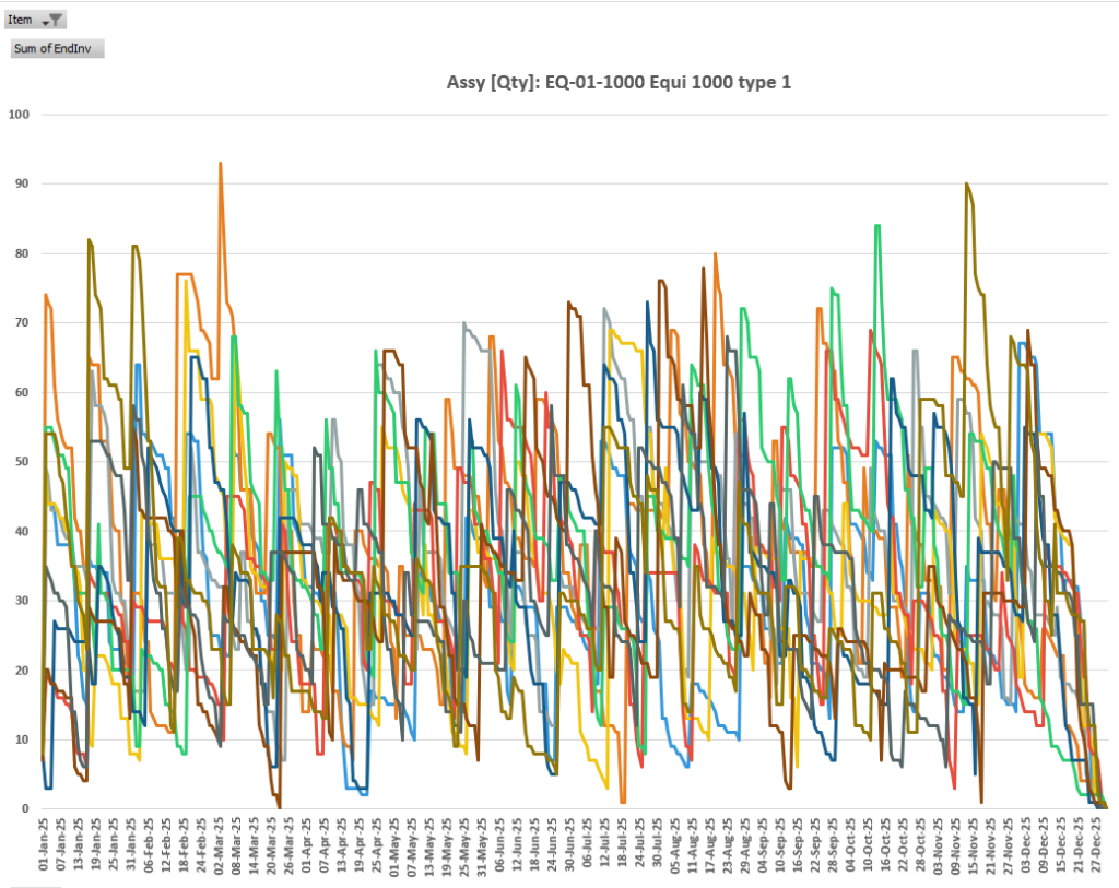 We generate the daily demand for each in our finished goods for one year according to the distribution as explained above. Starting from the inventory on hand, we project the inventory level by applying the min-max logic. This is generating assembly orders, for which we will need components