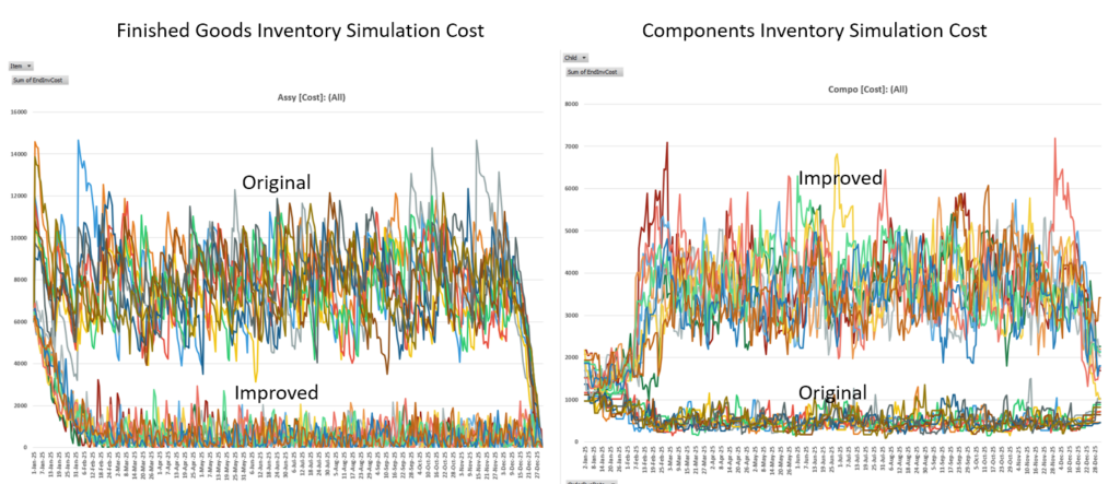 Here is the simulation chart of a finished good: note the significantly lower average inventory level.